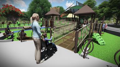 Our main feature is an accessible treehouse with slides and fun panels to play with. So many children with special needs are not able to climb up a ladder to play in a treehouse. With our one of a kind design, they can feel what it's like to be high up in a tree, but still be very safe. There may even be some wild animals hidden in there!